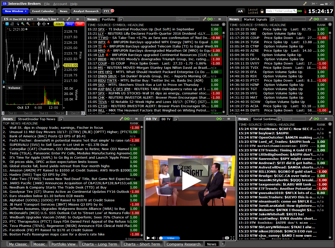 覆盖多种新闻来源,包括Street Insider头条新闻、Bloomberg TV、IB自有的交易员睿智、投资组合新闻等。所有新闻均包含社会舆情和信心评分。
