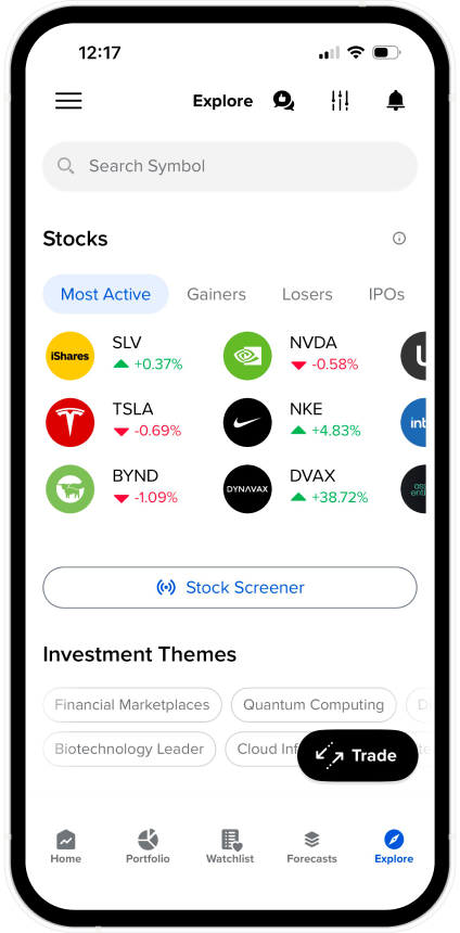 Trade 90+ stock markets worldwide, including NYSE, NASDAQ, LSE and HKSE. Access select US ETFs around the clock, plus forecast contracts and options – all from your mobile device.