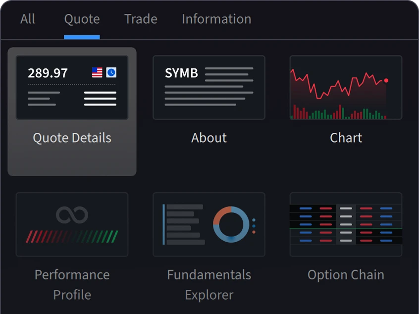 The Quotes menu provides access to a broad selection of powerful charting tools, options trading tools, news and Fundamentals Explorer.